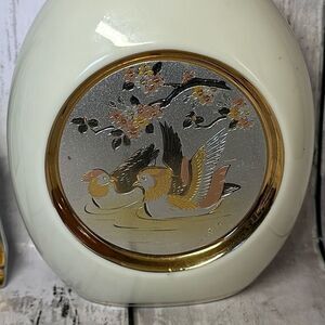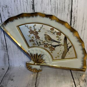 The Art of Chokin Engraved Bird Gold Rimmed Home Decor Fan and Vase