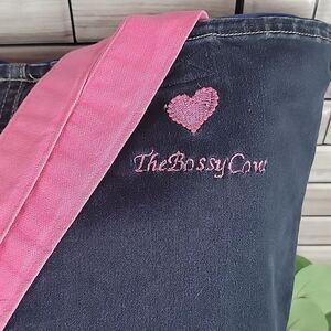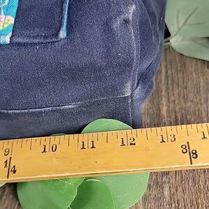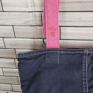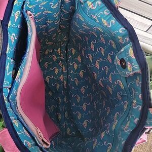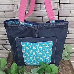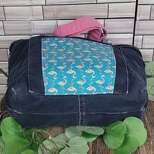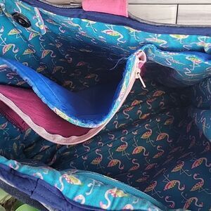 Soft padded denim cotton with flamingo print fabric details. Lots of room in this bag with a large compartment with two side zipper pockets and a top snap closure. Fun colors with bright pink handles. Good pre-owned condition. There is a mark on the pink handle, I'm guessing it's from glue. See pictures
