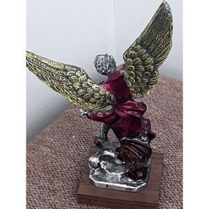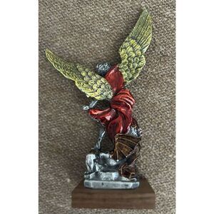 This iconic statue depicts Saint Michael the Archangel who is an archangel in Judaism, Christianity, Islam and the Baha'i faith. In this scene he has his foot on the head of a demon and is about to smite him with his sword. Michael is the chief of the angels and is the guardian prince of Israel and is responsible for the care of Israel. Christianity adopted him and he is mentioned in Revelations where he does battle with Satan. He is considered the patron saint of police officers, paramedics and the military.Current retail for this statue on Amazon is $371. The condition is gently used, no visible flaws.