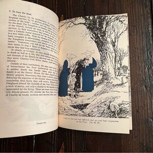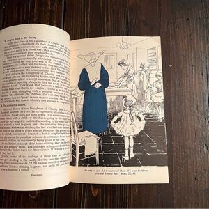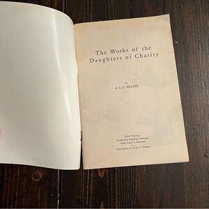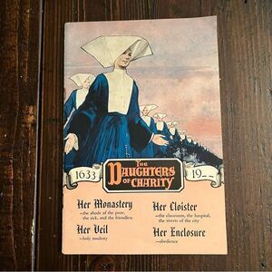 This pamphlet gives the history and acts of the Daughters of Charity. The item contains 48 pages. I am not sure of the age but the illustrations of the habit on their heads makes me believe it might be from the 1950 - 1960’s. The item is 8 1/2” x 6”. The pamphlet is in very good condition with a small tear on the cover. (see photo)