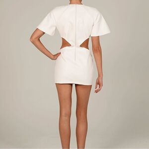 The Ziggy Dress from The Dolls House is an Ivory Vegan Leather T-shirt Dress with Cut Out Sides and Knot Detail.