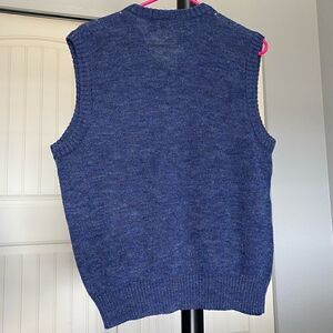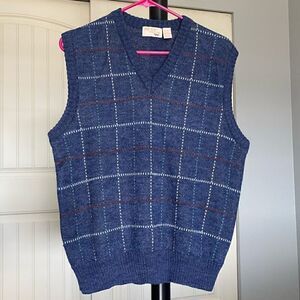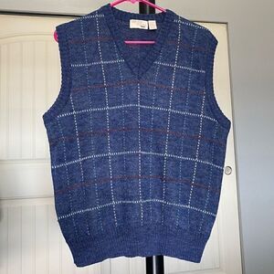 Blue with white and Burgandy horizontal and vertical stripes, sorta like plaid