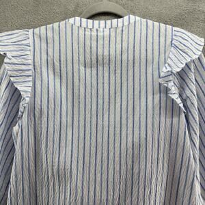 TheGET Top Womens S White Blue Striped Ruffle Button Up Crew Neck Preppy Career