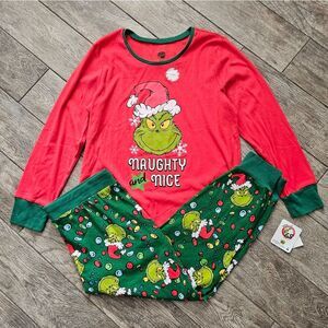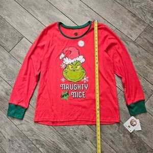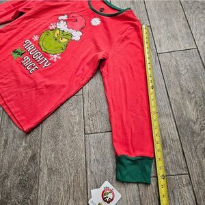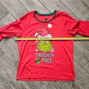 Shirt has a picture of the Grinch face in a Santa hat with snowflakes and says Naughty and Nice on the front