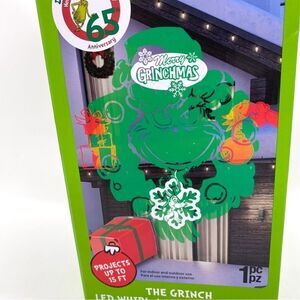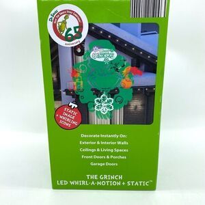 Dr. Seuss The Grinch LED Whirl-A-Motion and Static Projector Light Show New in box. Projects up to 15 feet. LightShow Projection Plus with Whirl-A-Motion + Static creates magical holiday lighting instantly. Featuring an image of The Grinch as Santa Claus and colorful, whirling accents. This Grinch holiday spotlight makes an eye-catching focal point on indoor or outdoor surfaces, including exterior or interior walls, living spaces, front doors, porches, garage doors and fences. Please see photos for more details.