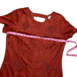 THE IMPECCABLE PIG Boutique Faux Suede Short Sleeve Embroidered Dress in burnt orange/rust.