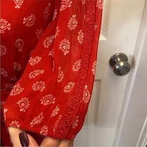 Elegant red wrap dress with a floral pattern. Perfect for any occasion.