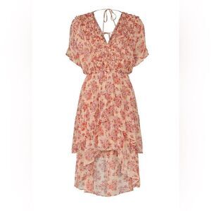 The Kooples Floral Frill Dress is totally twirl worthy. Pink floral printed chiffon (100% Viscose). Hourglass. Short sleeves. V-neckline. Ruffle hemline. Hidden back zipper closure. 34" from shoulder to shortest hemline. Imported.