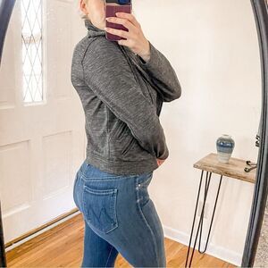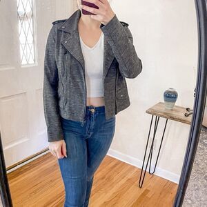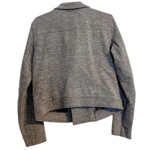 Features: long sleeves, open collar, shoulder straps, asymmetric front zipper, zipper pockets, cropped waist length, soft stretchy mid weight material, heathered grey