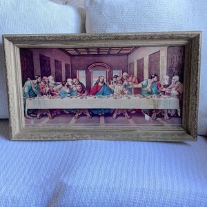 “The Last Supper” is a High Renaissance painting done by Leonardo Da Vinci that depicts a portrait of Jesus with his twelve apostles, during a time that he is told that one of his apostles with betray him. This painting the most world renowned and notable painting of its time. There are two white flaws on the bottom, a bubble on the right side, and what looks like a small coffee spill, but it could also be part of the painting, all shown in photos. Approximate measurements shown in photos. The frame is beautiful, and without any flaws, but there is no glass on the frame, which makes it very light for shipping.