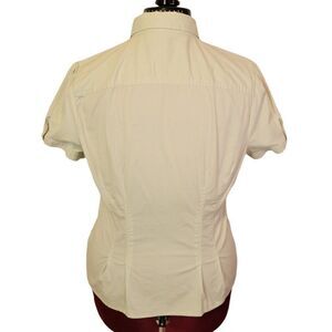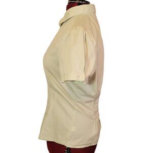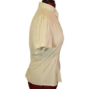 Light green color, fitted, pleated on front, collared, short sleeves, button down, lightweight, breathable and has a little bit of stretch. Great condition.