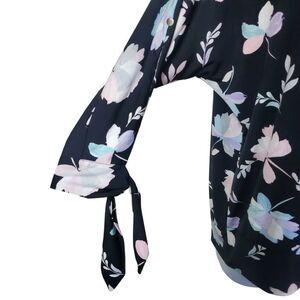 • Boatneck blouse with split tie sleeves. Features several pastel hues within the floral pattern.