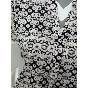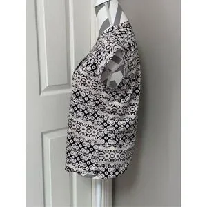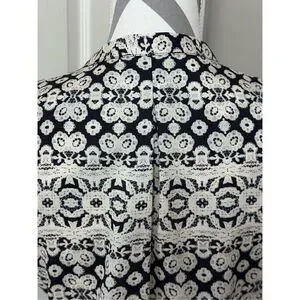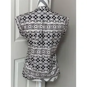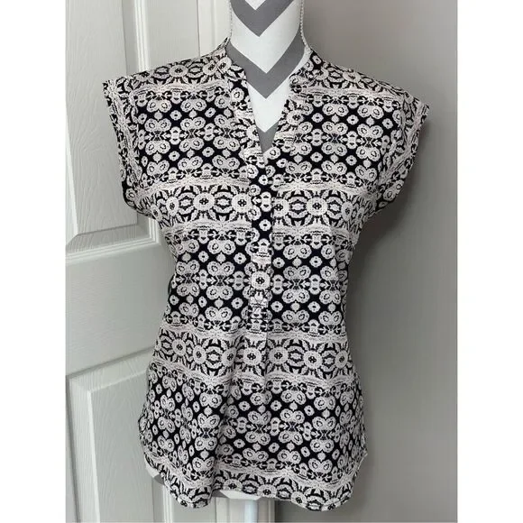 Beautiful The Limited patterned blouse in navy and cream size small. This features a mandarin style collar with pleated v-neck button closure and cap sleeve. Pleated back yoke. Very flattering fit. Rarely worn. EUC. Extra button.