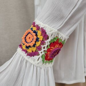 Long Sleeves with flared cuffs - colorful crochet granny square details at wrist.