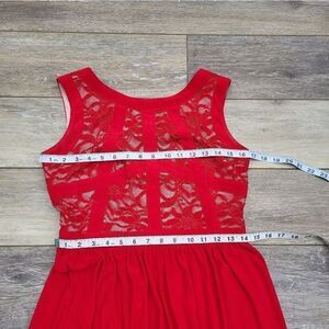 The MORGAN & CO red special occasions dress is the perfect addition to your wardrobe for any formal event. The stunning lace detailing on the top is accentuated by 1" wide ribbon, creating an elegant and sophisticated look. The dress features a tan underlining in the bodice, which adds a touch of contrast to the bold red color. The sleeveless design is perfect for warmer weather, and the gathered waist creates a flattering silhouette. Whether you're attending a wedding, prom, or any special event, this dress is sure to turn heads and make you feel confident and beautiful.
