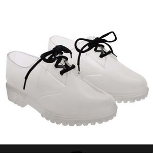 A little bit vintage and a little bit mod, this playful lace-up shoe pairs a transparent jelly upper with a kicky clear sole. Perfect for showcasing your jazziest socks.