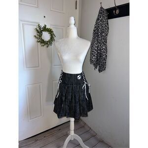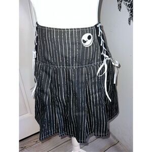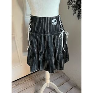 All hail the Pumpkin King! Get a look that will make flesh crawl with this The Nightmare Before Christmas skirt! Featuring Jack Skellington's signature pinstripe pattern. Comes with a wide yoke waistband with Jack's face embroidered at the hip and lace-up detailing. Complete with back zipper closure.