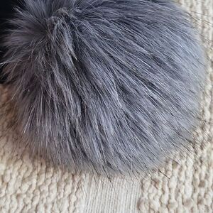 Chic black scarf with soft gray pom poms. Ideal for cozy elegance.