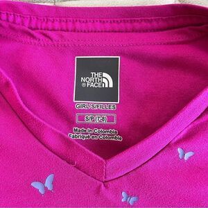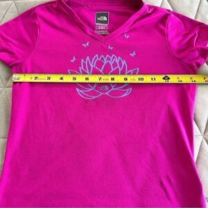 Tags: girls north face short sleeve top athletic wear athleisure quality fashion brand deep purple magenta periwinkle logo lotus v-neck preowned preloved secondhand gym gymnastics hiking running working out quality outdoor brand back to school