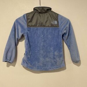 Soft and cozy The North Face girls’ full-zip fleece jacket in size XXS (5). Features a light blue plush fleece body with a gray nylon yoke and trim, two front pockets, and elastic cuffs for warmth. Perfect for layering in cooler weather or outdoor adventures. Name label inside has writing (does not affect wear). From a pet-friendly, smoke-free home.