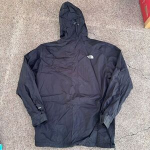 Keywords: The North Face, men's rain coat, waterproof jacket, hiking, camping, casual wear, fall jacket, black raincoat, adjustable hood, breathable, lightweight, pre-owned, outdoor gear, full zip closure.