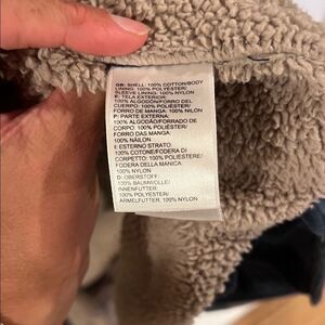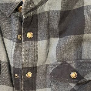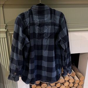 Casual and versatile shirt jacket. Features a navy checkered pattern. Ideal for layering in cooler weather. Interior is kind of Sherpa lined for warmth