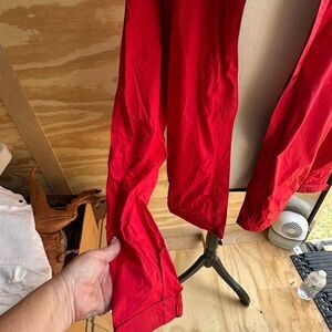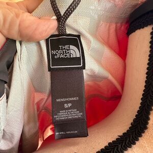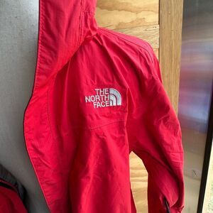 Bold red jacket with hood by The North Face. Ideal for outdoor activities.