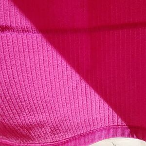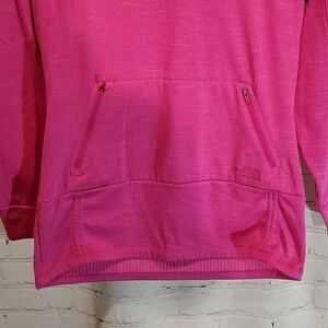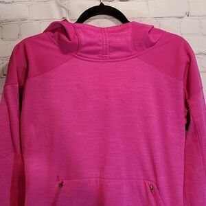 In very good used condition faded spot on the front as shown. Hot pink with a fleece lining. Attached hood and zippered front pockets.
