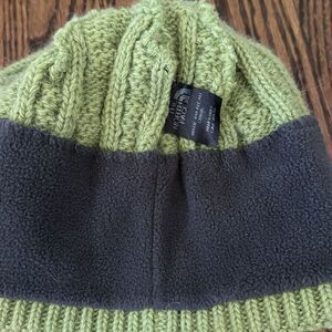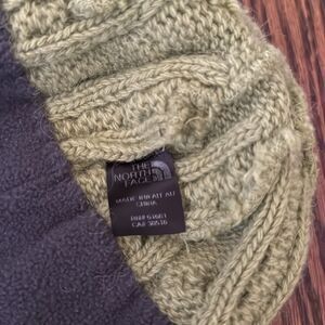 The North Face light green wool/acrylic/alpaca blend cable knit beanie. Fleece headband 100% polyester lining. Embroidered logo tab at ribbed edge. Excellent condition. Nonsmoking home.