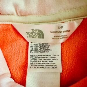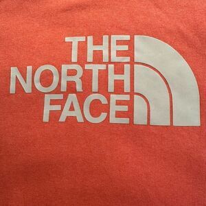 Step out in this timeless and casual, bright coral colored, The North Face hoodie pullover. Featuring a standard fit, ribbed cuffs & hem, kangaroo hand pockets and front logo in white. Length 23” x Width 18” pit to pit.