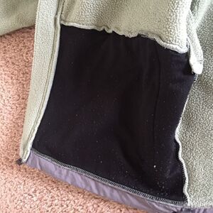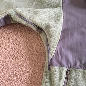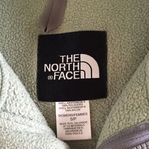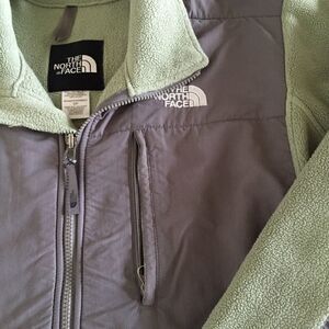 Warm and cozy green and gray fleece jacket from The North Face. Size S (fits true to size). Worn, there are pills on the inside but can be easily taken off with a de-piller. Otherwise, in great condition. Comes with several zippers - one on the left side and also on the sides that extends to the forearm. Retails for over $100 before tax.