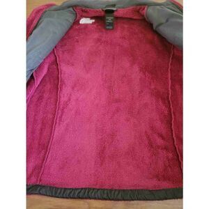 The North Face Full Zip Fleece Jacket. Color is like a Magenta. Two zipper pockets, jacket clips on sleeves, and a sinchable waistband. Soft and warm. In great condition. 100% polyester. All zippers in working condition as shown in pictures. Approximate measurements also shown in pictures. Size Medium