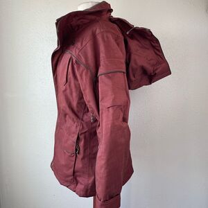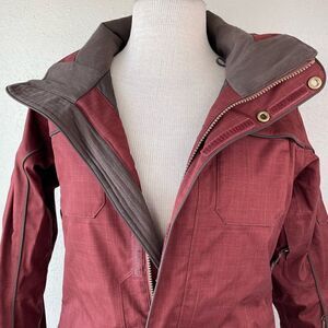 Classic North Face ski jacket in excellent preowned condition featuring a removable hood. It measures 21 inches armpit to armpit lying flat, 19 inches at the waist, and 27 inches in length from shoulder to hem.
