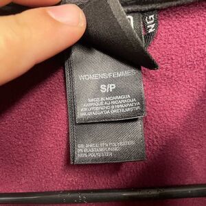 Great jacket that’s thin while keeping warm. In great used condition. Light wear on the inside. Maroon color with fruit print. Size small