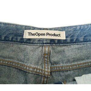 TheOpen Product women's medium wash distressed denim jeans. Jeans have distressed knees and a high rise waist. They're made of 100% cotton and are a woman's size 2 which translates to a 28" waist.