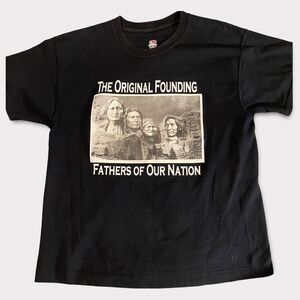 Native American Graphic Tee on a modern fruit of the loom tag. Featuring a graphic of native american chiefs as the faces of mount rushmore. Reads “The Original Founding Fathers of our Nation”.