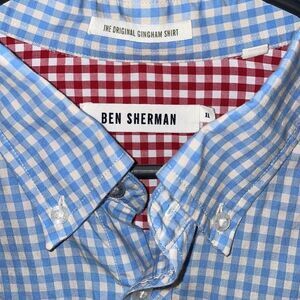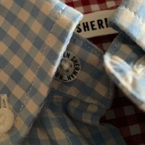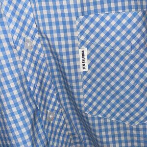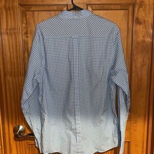 Blue and white gingham, long sleeve, dress shirt in excellent condition. No issues to note.