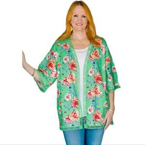 The Pioneer Woman Green Apple Floral Duster Kimono Crochet Trim Size Large XL