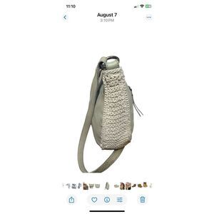 Super cute leather crossbody with crocheted edged, adjustable strap, lined interior, top zip closure, front zip pocket and signature logo