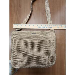 This is a fun bohemian bag. This bag is versatile with various fashion styles. Because of the neutral tone of the bag it can be used as an everyday bag. The bag is pre-owned with normal wear. There is a mark in the inside lining of bag.Bag measures approximately 10 inches wide and 9.5 inches long. The handle is approximately 12 inches long.Preview pictures for a visual description before purchasing.