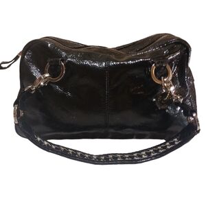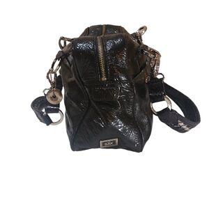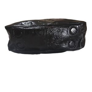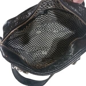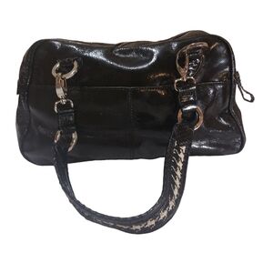 Patent leather exterior with partial Tweed handles and a large snap pocket