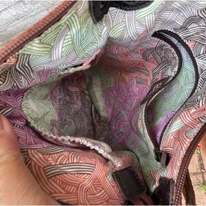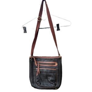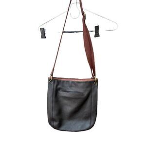 The Sak espresso brown leather crossbody. Very dark brown ( almost black) pebble grain leather. Adjustable strap. Small front open pocket with a zippered pocket behind it. Top Zippered with a zippered sidewall pocket. Two open pockets as well. Very clean and one scratch scuff mark on back.