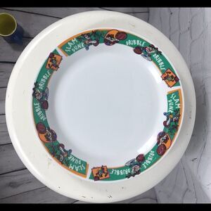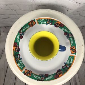 Cute 2 pieces on the Tasmanian devil from Looney Toones. Both in excellent condition. Some scratches on the plate, no chips cracks or crazing. Plate is Basketball themed in orange and green with Taz all over it measures 9 3/4” diameter. The cup is 3D with blue on the outside and yellow on the inside. Measures 4.5” tall and 3.5” diameter.