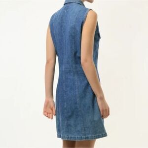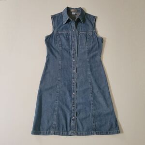 Chic and versatile denim sleeveless dress perfect for casual outings. Features a snap-down front for easy wear. Stock photos are of a similar dress. New condition.