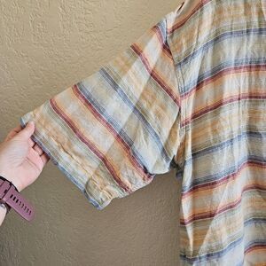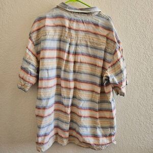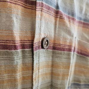 This is a button down shirt by The Territory Ahead. It features multicolored stripes and natural look buttons. There is a buttoned pocket on the chest.