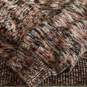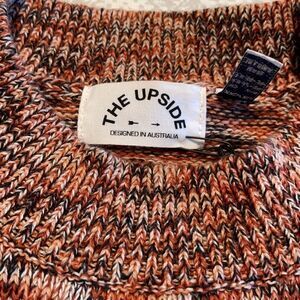 The Upside Arina Knit Sweater Cropped Sweater. Shades of brown and orange. Signature arrow on the arm. Made of cotton.