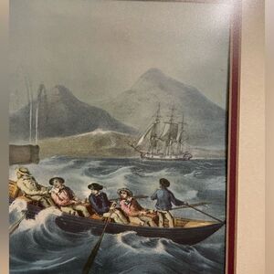 This Lithograph print by Nathaniel Currier is based on Garneray’s painting of the same name. It depicts the pursuit of the sperm whale, which is said to be one of the largest and fiercest of all of the whales. The large mountains echo the shape of the whales tail, and the rolling waves add to the drama. The original was oil based, and created in 1852.