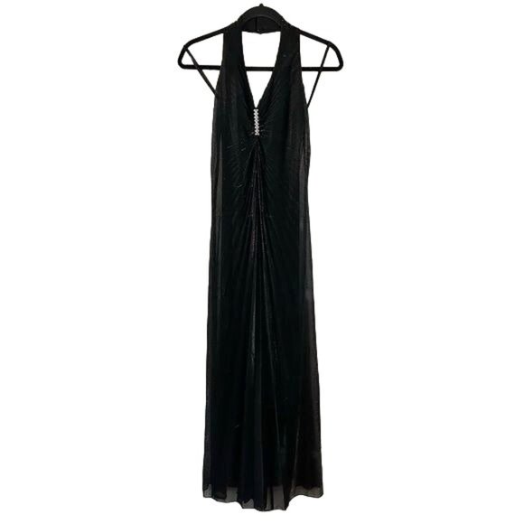 Thea Dora Halter Evening Gown, Black Shimmer Rhinestone Pleated Whimsigoth Sz 10