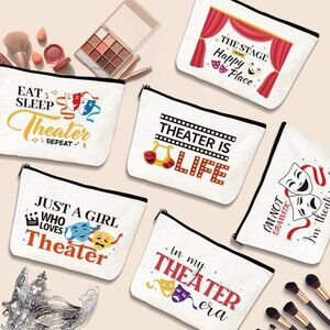 6Pcs Theatre Themed Makeup Bags: This theatre makeup bags includes 6 stylish and fun cosmetic bags, each measuring approximately 22 x 15 cm. Featuring playful and inspiring designs like "Just a Girl Who Loves Theatre," "Eat Sleep Theatre Repeat," and "In My Theatre Era," I'm Not Dramatic I'm Theatrical " these theatre makeup bags are perfect for theatre lovers, performers, or families friends who love theatre