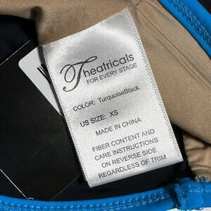 Key search words: Theatricals, dance set, two-piece, adult XS, extra small, blue top, black leggings, capri, nylon spandex.